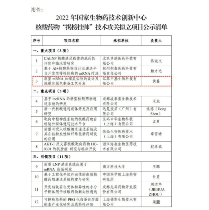 近日,國家生物藥技術創新中心發布了2022年國家生物藥技術創新中心核酸藥物“揭榜掛帥”技術攻關擬立項目公示清單。核酸藥物“揭榜掛帥”項目是國家生物藥技術創新中心發布的首個技術攻關方向,該項目由譚蔚泓院士組織開展專家論證,凝練形成了新型高效遞送系統,新靶點、新機制核酸藥物發現研究,以及核酸藥物原材料、儀器設備開發三大技術攻關方向。來自全國的優秀核酸藥物研發團隊的共169份揭榜申請,最終立項39項,其中重大項目3項。北京多納醫藥科技有限公司申報的“CALNP核酸遞送載體的成藥性評價和臨床前研究”項目作為新型高效遞送系統項目代表,入選重大項目。