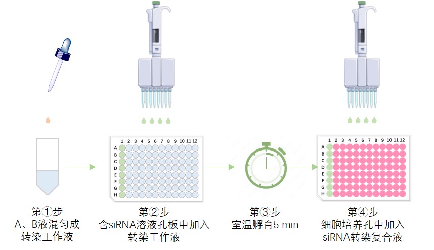 A、B液混合成轉染工作液后,可用多通道移液器批量進行siRNA轉染復合物配制及加藥。