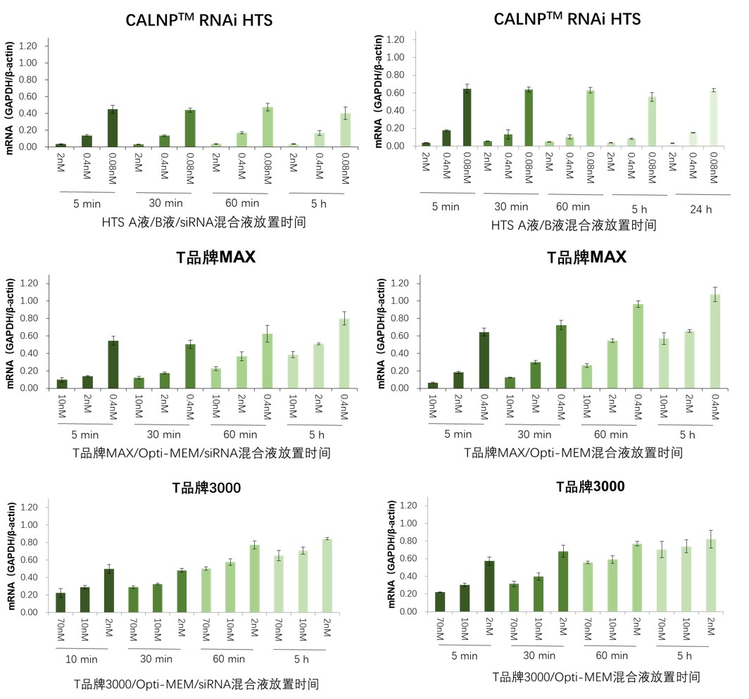 轉染工作液和siRNA轉染復合液在長時間放置的情況下,轉染效率無顯著變化,確保高通量序列篩選實驗中,前后配液的序列不因轉染試劑穩定性導致序列效率差異,避免遺漏高效率序列。