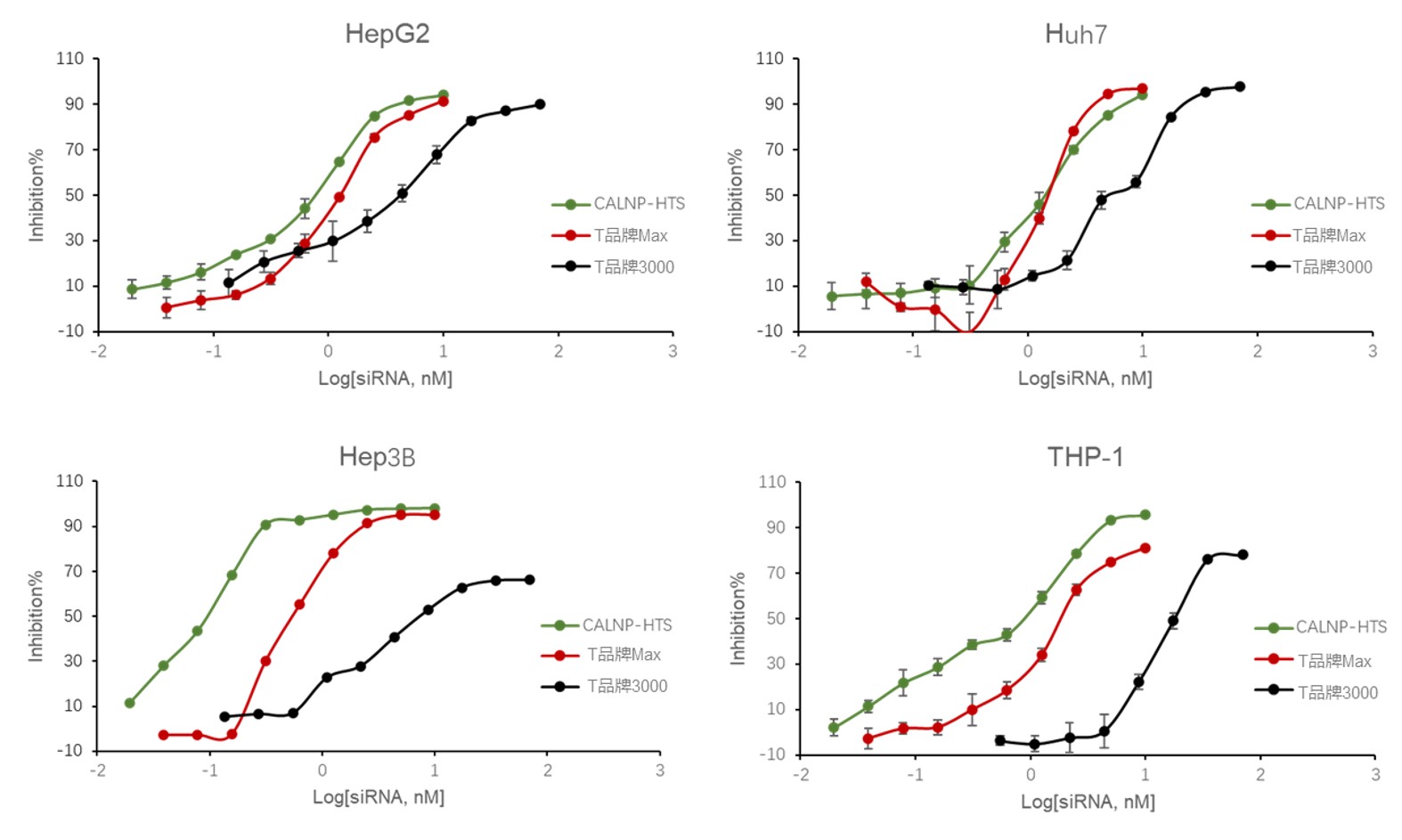 本試劑轉染siRNA具有超高的靶基因敲低水平,在多種細胞上靶基因抑制水平均達到或大幅度優于國際領先試劑品牌水平。