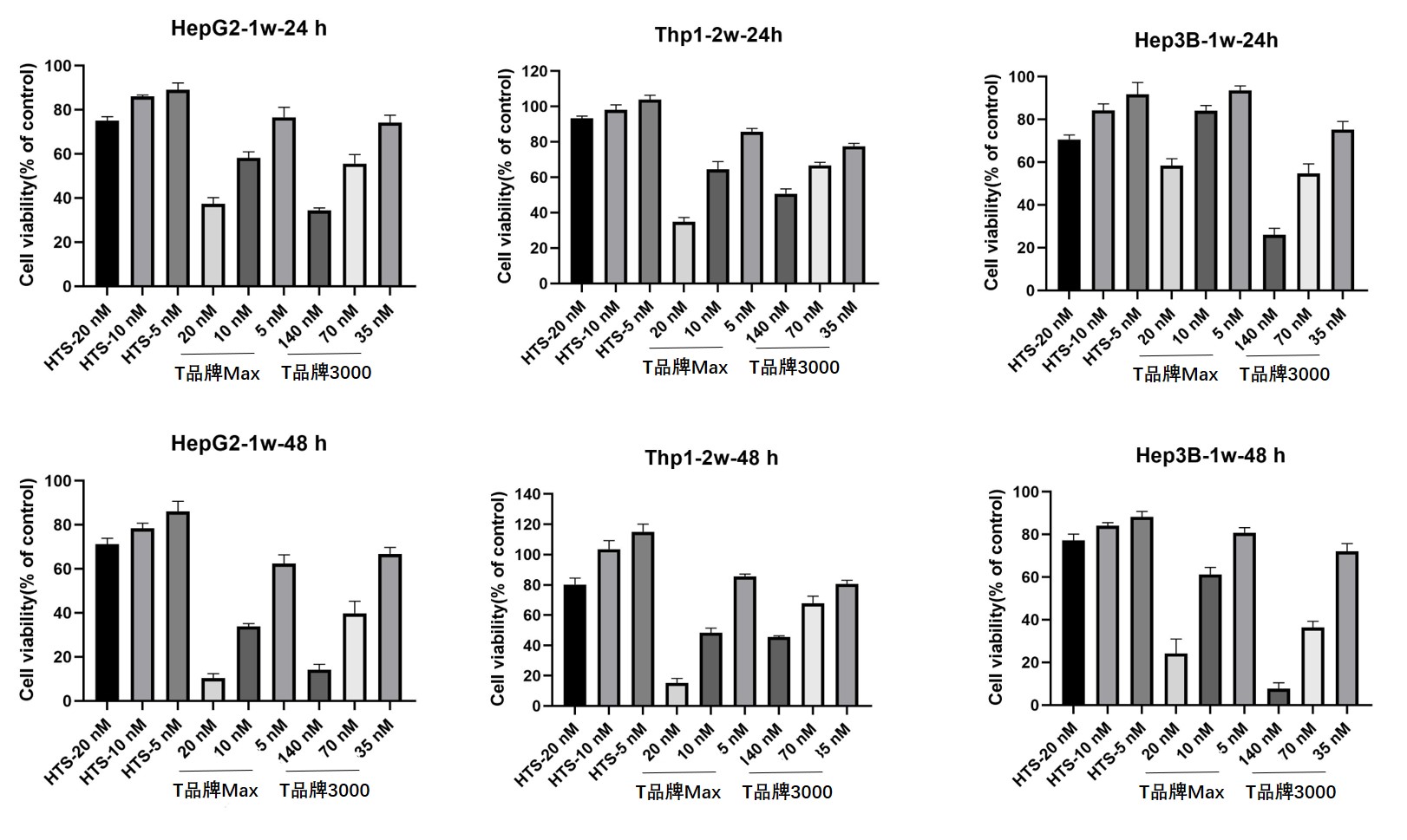 本試劑在實現超高的靶基因抑制水平同時,具有極低的細胞毒性,在轉染試劑推薦使用濃度的上下2倍范圍內測試,不同細胞上均維持良好的細胞活力。