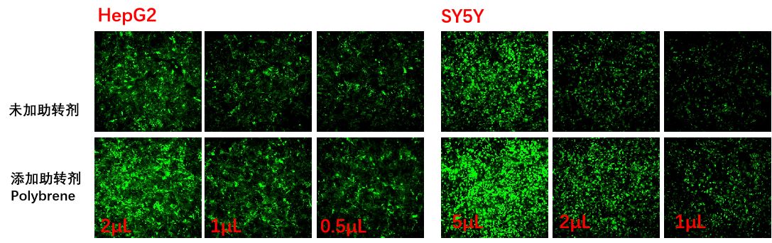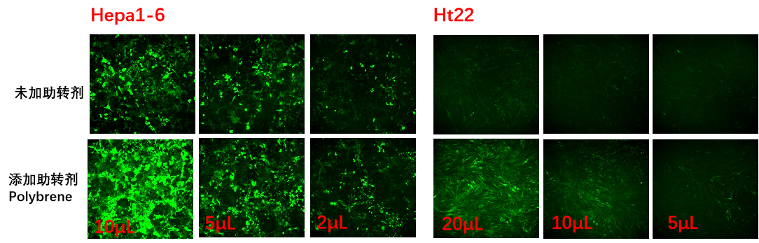 示例中使用的慢病毒顆粒滴度為1E8 TU/mL,顯微倍數(shù)10×,其中HepG2、SH-SY5Y鋪板細(xì)胞密度為1E5 cells/mL,96孔板100 μL , Hepa1-6、Ht22鋪板細(xì)胞密度為5E4 cells/mL,96孔板100 μL。鋪板24 h后,使用不同體積的慢病毒進(jìn)行感染,設(shè)置添加助轉(zhuǎn)劑的對(duì)照組(5 μg/mL polybrene), 感染后24 h換液,72 h后拍照 。由于慢病毒顆粒及Polybrene對(duì)細(xì)胞有一定毒性,可根據(jù)細(xì)胞感染陽(yáng)性率(80%)及細(xì)胞狀態(tài)(無(wú)異常)選擇合適的感染條件進(jìn)行放大實(shí)驗(yàn)。
