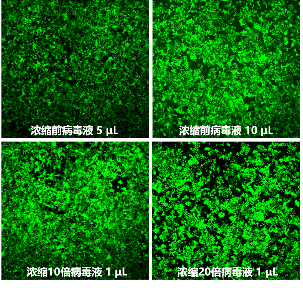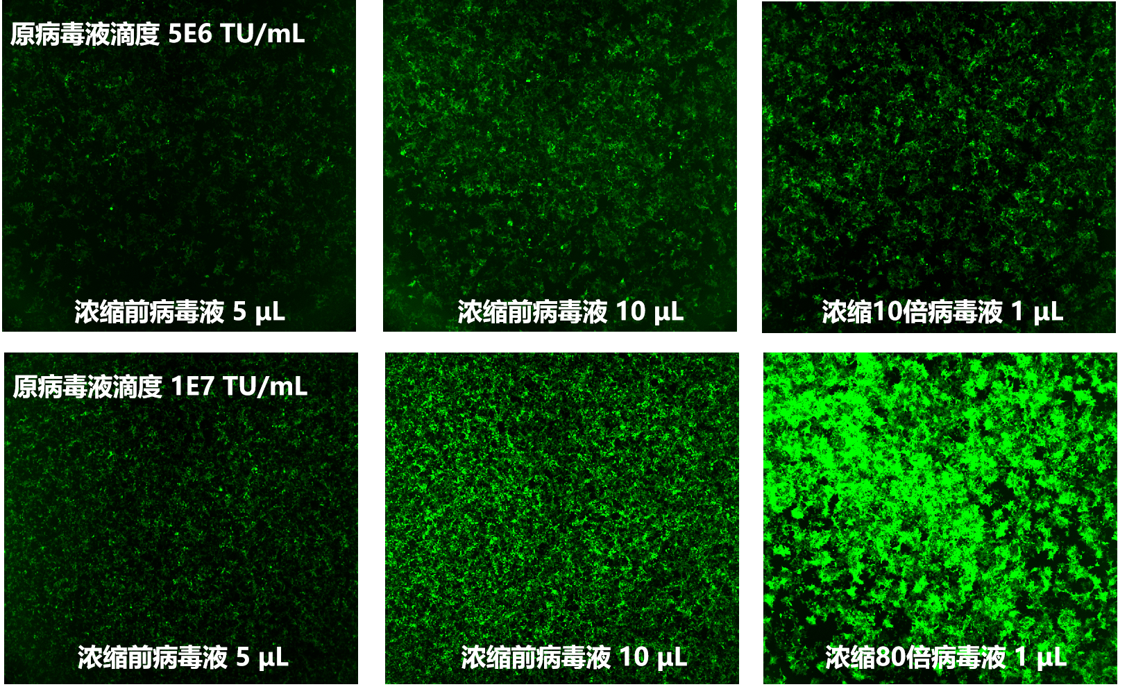 某過表達慢病毒(轉移質粒大小約10 kb)使用E-poly? Fast-Lv包裝試劑盒正向包毒48小時后收毒,測定病毒上清液出毒滴度分別為5E6 TU/mL和1E7 TU/mL。而后采用慢病毒濃縮液分別進行10X和80X濃縮后染毒結果對比如下: