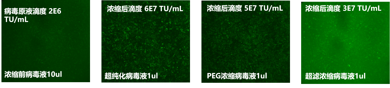1.將某過表達(dá)慢病毒(2E6 TU/mL)使用不同方式濃縮,其中超純化濃縮離心時(shí)間設(shè)置為4h,PEG濃縮液低溫孵育時(shí)間設(shè)計(jì)為6h,離心后使用PBS重懸沉淀,超濾條件為100KDa離心管,4000xg 4℃離心,體積濃縮60倍,得到的濃縮產(chǎn)物感染HEK293T細(xì)胞,染毒44h結(jié)果對(duì)比如下: