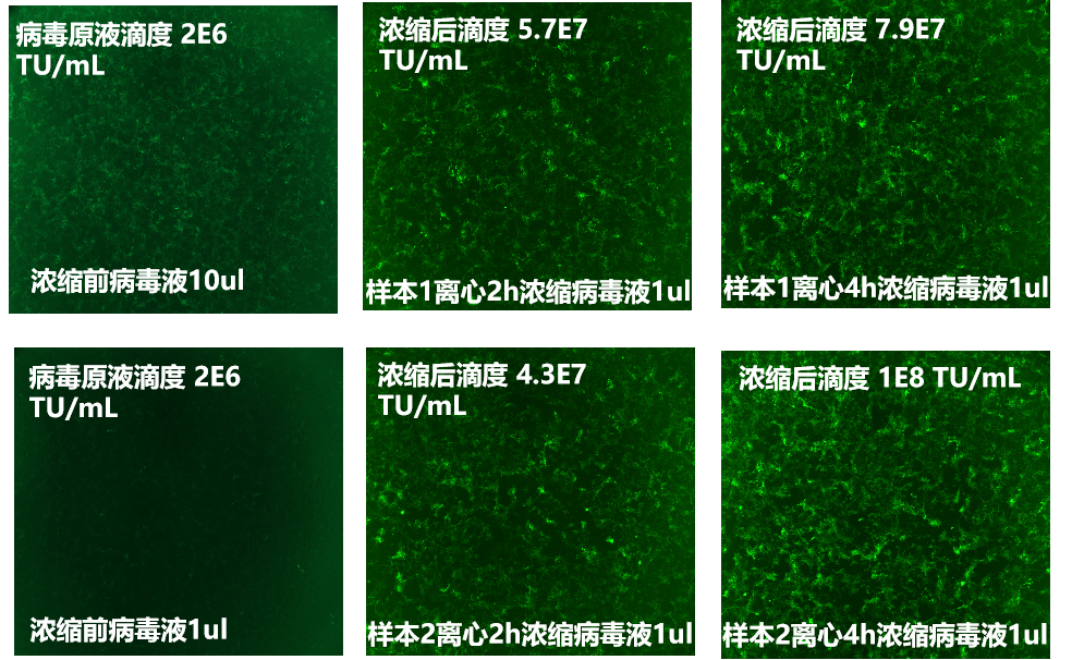 4. 回收的病毒活性滴度高。本產(chǎn)品在濃縮過程中能保持病毒生物活性,能在同等病毒添加量下,達(dá)到更好的染毒效果。